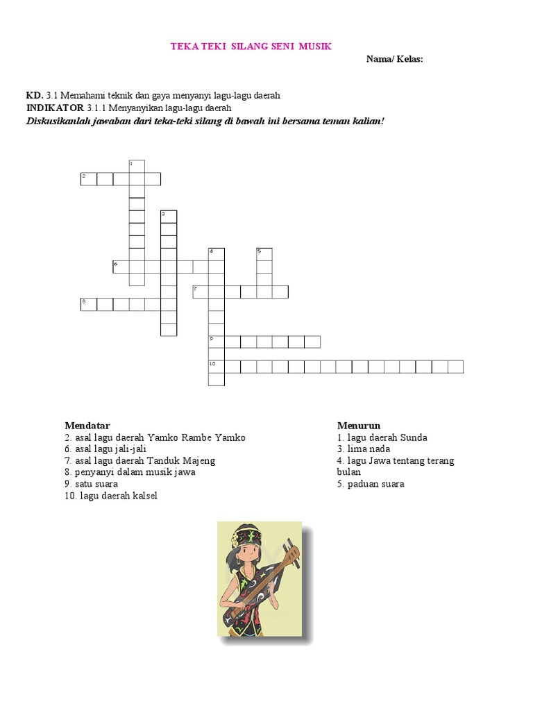 Teka teki silang seni budaya beserta jawabannya. Soal uas seni budaya kelas x semester 1 beserta jawabannya. Teka teki yang sulit. Coba isi dan jadikan kegiatan.