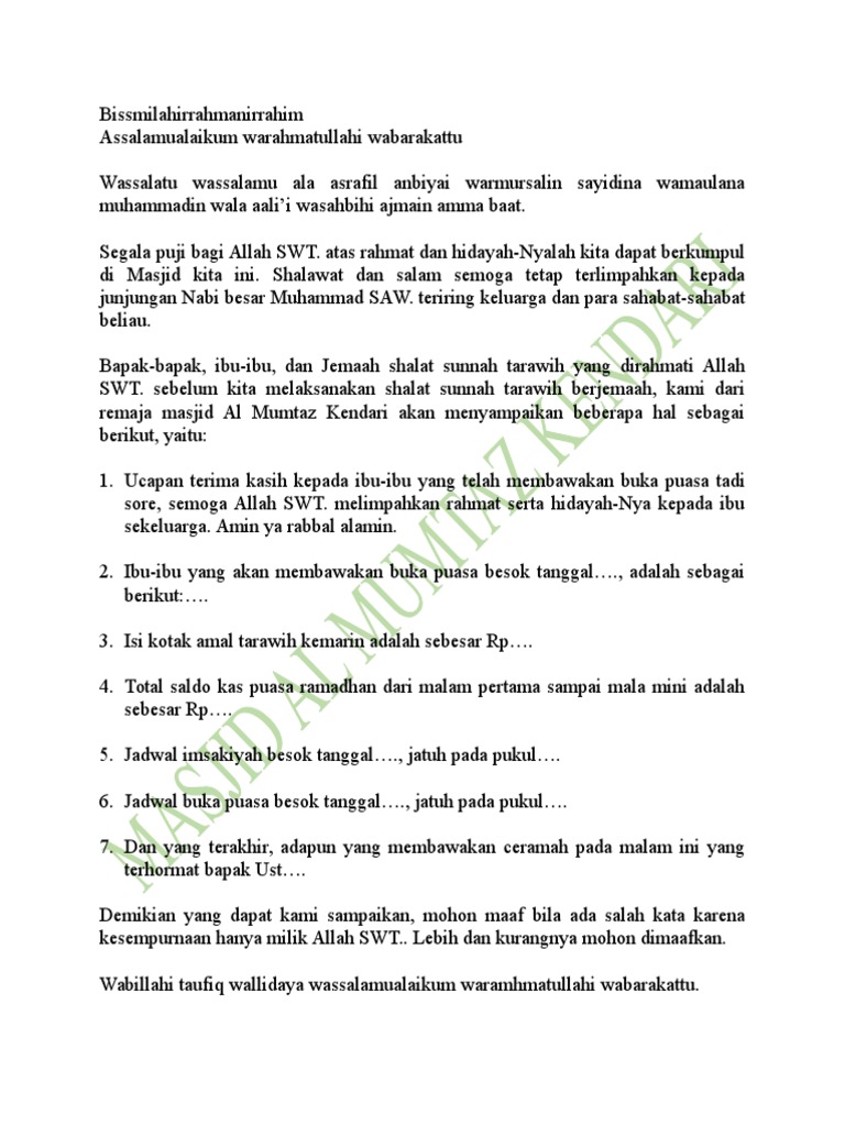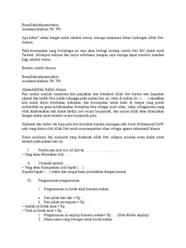 Berikut contoh teks tersebut. Hadirin jamaah Masjid Al-Ikhlas sebelum kita mendengarkan ceramah dan shalat tarawih berjamaah atas nama DKM saya --FULAN-- akan sampaikan beberapa informasi. Contoh Teks MC protokol Shalat Sunat Tarawih Masjid Nurul Fathi Mampawa.