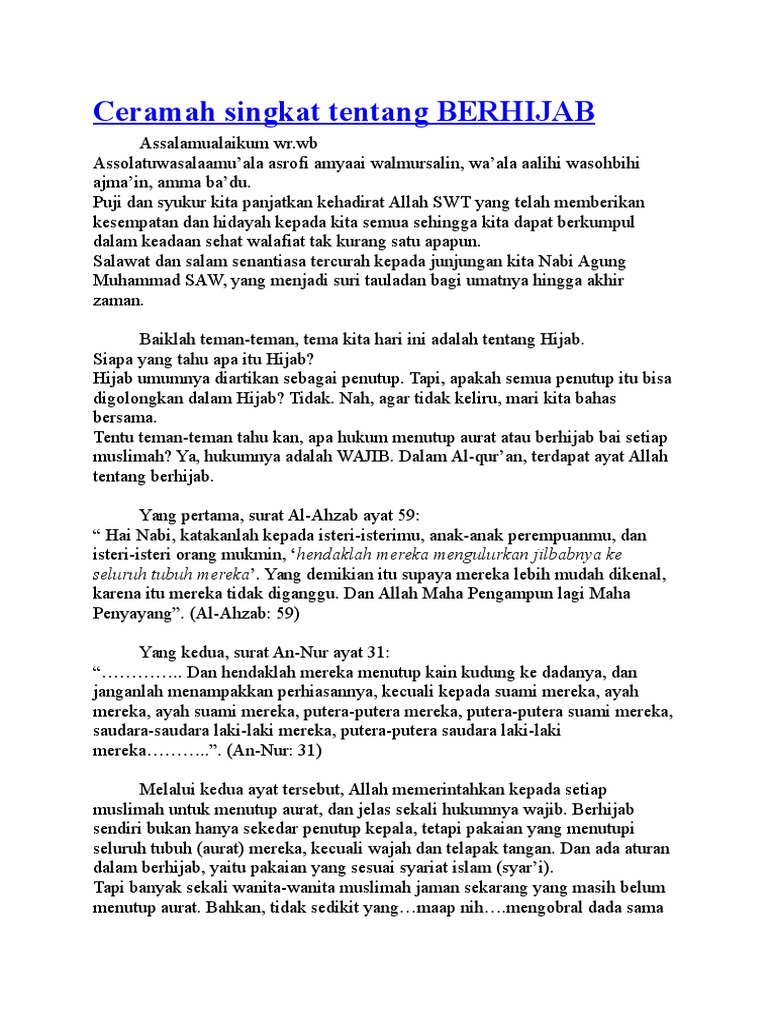 2019-05-09 Transkrip Kultum Singkat Tentang Wanita Mengapa Mereka Terjerumus Ke Neraka. Contoh Ceramah Tentang Seberapa Siapkah Muslimah untuk Berhijab Ditulis Admin Sabtu 03 Oktober 2020 Tulis Komentar Edit. Kami juga memberikan cara membuat teks pidato yang baik dan benar.