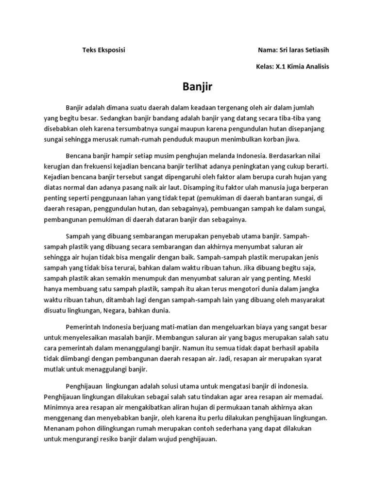 Masyarakat yang membuang sampah kesungai tersebut tidah berfikir bahwa dengan membuang sampah kesungai sampah itu akan menyumbat. Sekedar menyebut contoh banjir yang terjadi di Jakarta 17 Januari 2013 lalu. Teks Eksposisi Tentang Lingkungan Secara terminologi teks eksposisi merupakan sebuah teks yang bersifat mengajak dan diisi dengan beberapa informasi yang ditulis secara ringkas dan jelas.