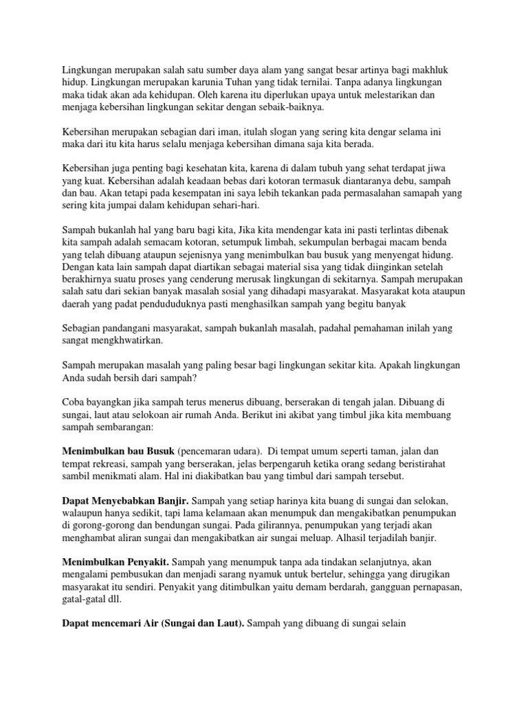 Selain itu sampah juga dapat mendatangkan bencana seperti banjir dan tanah longsor. Pada umumnya teks ini akan membahas sebuah topik yang sangat menarik untuk dibaca. Sampah yang dibuang ke sungai terutama sampah anorganik mengakibatkan aliran sungai tersumbat.