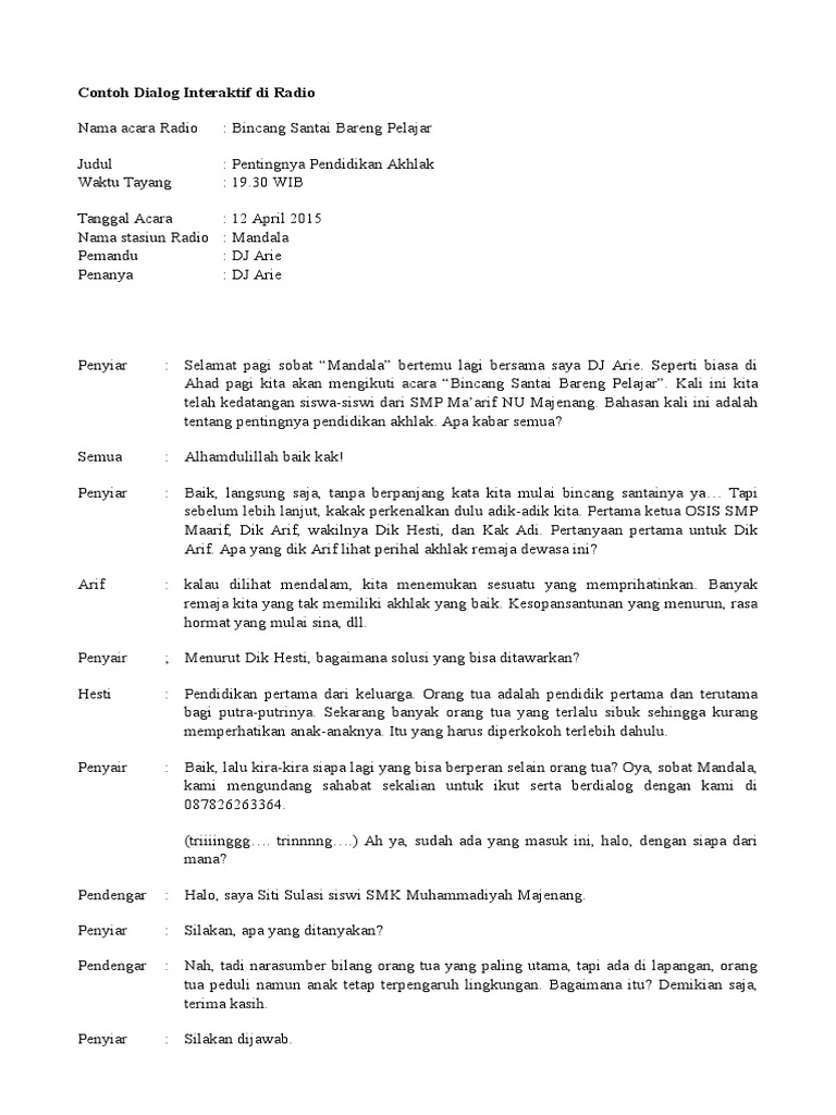 Kali ini kita akan membahas sebuah pembelajaran bahasa indonesia tingkat smasmk mengenai dialog interaktif adapun disini kita akan membahas mengenai pengertian dialog interaktif beserta 7 contoh dialog interaktif di tv tentang pendidikan kebersihan kenakalan remaja dan kesehatan. Tugas individu laporan wawancara dengan seorang guru bab i. Oleh karena tersebut di dalamnya tidak jarang kali ada sesi tanya jawab antara responden dan MC.