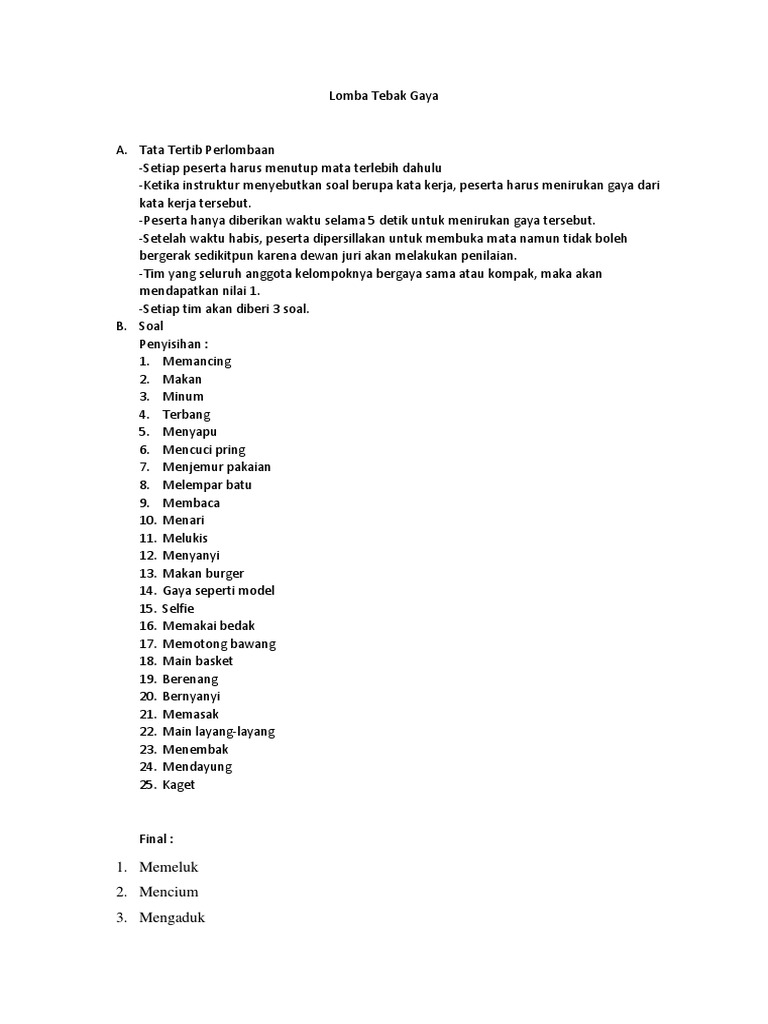 Tata Tertib Perlombaan-Setiap peserta harus menutup mata terlebih dahulu-Ketika instruktur menyebutkan soal berupa kata kerja peserta harus menirukan gaya dari kata kerja tersebut-Peserta hanya diberikan waktu selama 5 detik untuk menirukan gaya tersebut. Pin Oleh Who Am I Di Random Meme. Kata untuk tebak gaya.