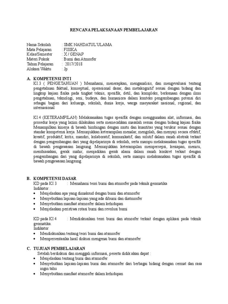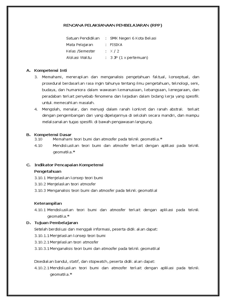 Hubungan teori bumi dan atmosfer pada teknik geomatika C4 C. Menjelaskan teori atmosfer Menganalisis teori bumi dan atmosfer pada teknik geomatikal dengan baik dan benar 410Denngan berlatih langsung pengerjaan soal secara terbimbing peserta didik Mendiskusikan teori bumi dan atmosfer terkait dengan aplikasi pada teknik geomatika dengan terampil dan tanggung jawab Kegiatan Pembelajaran. 411 Menggunakan alat sederhana dalam percobaan yang berhubungan dengan kalor.
