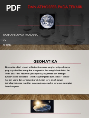 RAYHAN DEWA PRATAMA 25 X TPB GEOMATIKA Geomatika adalah sebuah istilah ilmiah modern yang berarti pendekatan yang terpadu dalam mengukur menganalisis dan mengelola deskripsi dan lokasi data - data kebumian data spasial yang berasal dari berbagai sumber antara lain satelit - satelit yang mengorbit bumi sensor - sensor laut dan udara. KOMPETENSI DASAR KOMPETENSI DASAR 311 Menganalisis proses pemuaian perubahan wujud zat dan perpindahan kalor dengan konsep suhu. Atmosfer terhadap lautan 15 Bumi dalam runag angkasa.